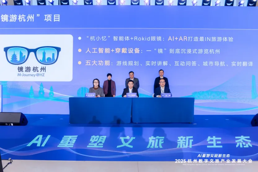 12月15日,在2025杭州数字文旅产业发展大会上,Rokid、杭州市文化广电旅游局、支付宝三方签署 “镜游杭州”项目合作协议,宣布以 “智能眼镜 + 文旅AI智能体” 为核心,打造沉浸式旅游新体验。