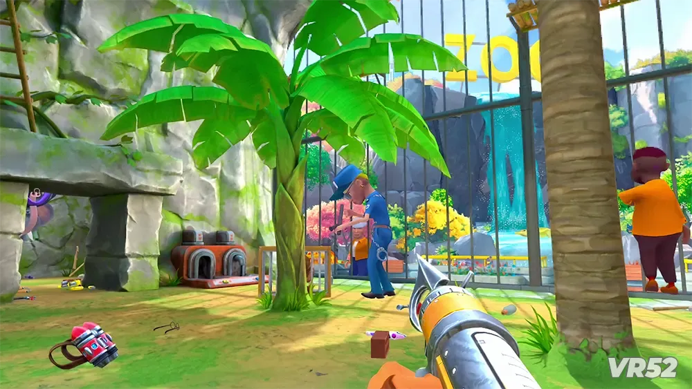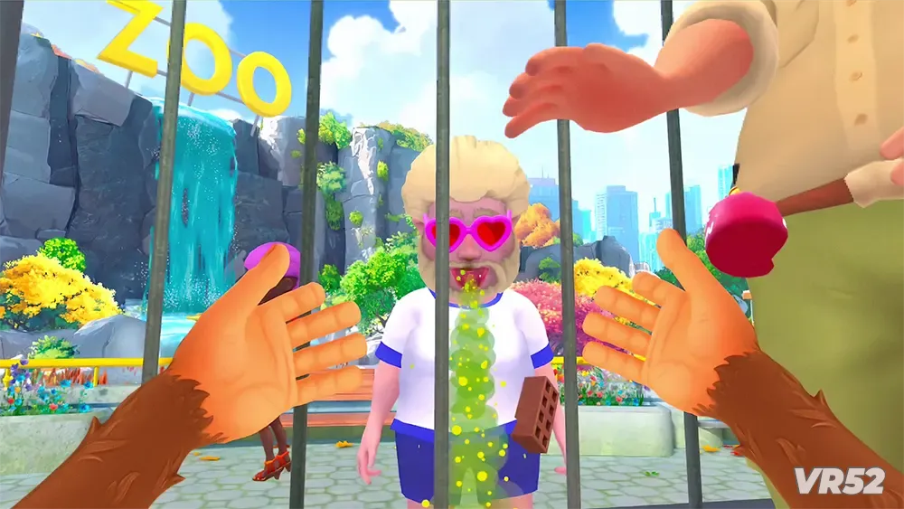 《我是猴子》(I Am Monkey)提供物理驱动的沉浸式交互系统:玩家可攀爬、摆荡、投掷香蕉,甚至悄悄夺走游客手中的物品。环境具备沙盒特性,允许自由探索与即兴发挥。比如用树枝撬开饲料箱,或在雨天故意滑倒引发游客惊呼。