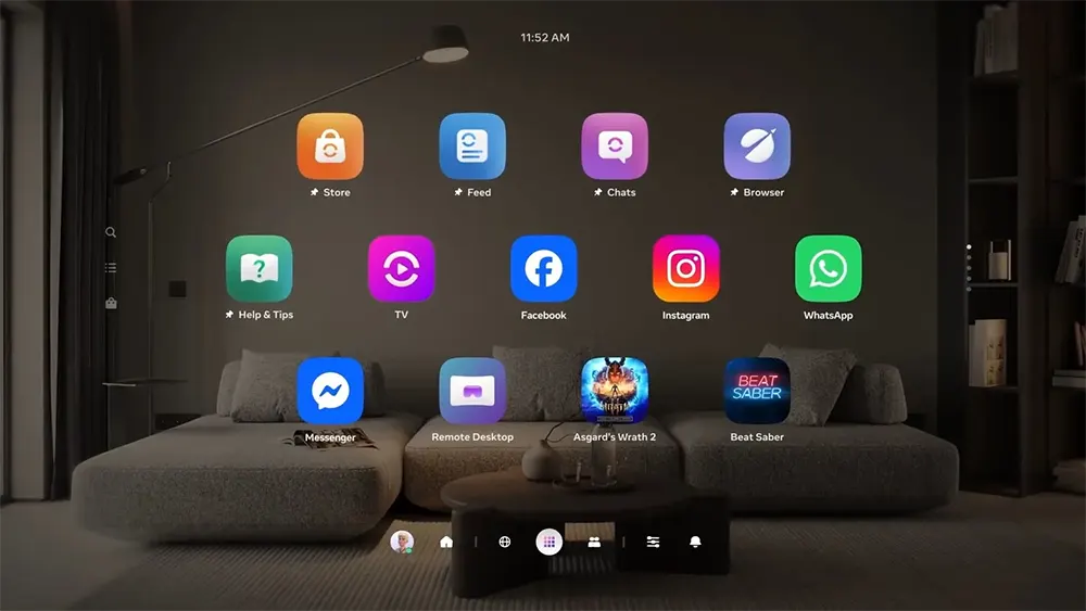 自Oculus Go发布七年来,Quest系统的UI架构基本保持一致:一个悬浮于下方的水平菜单栏(通用菜单)承载时间、电量、应用快捷方式等信息,所有2D界面以独立窗口形式弹出。