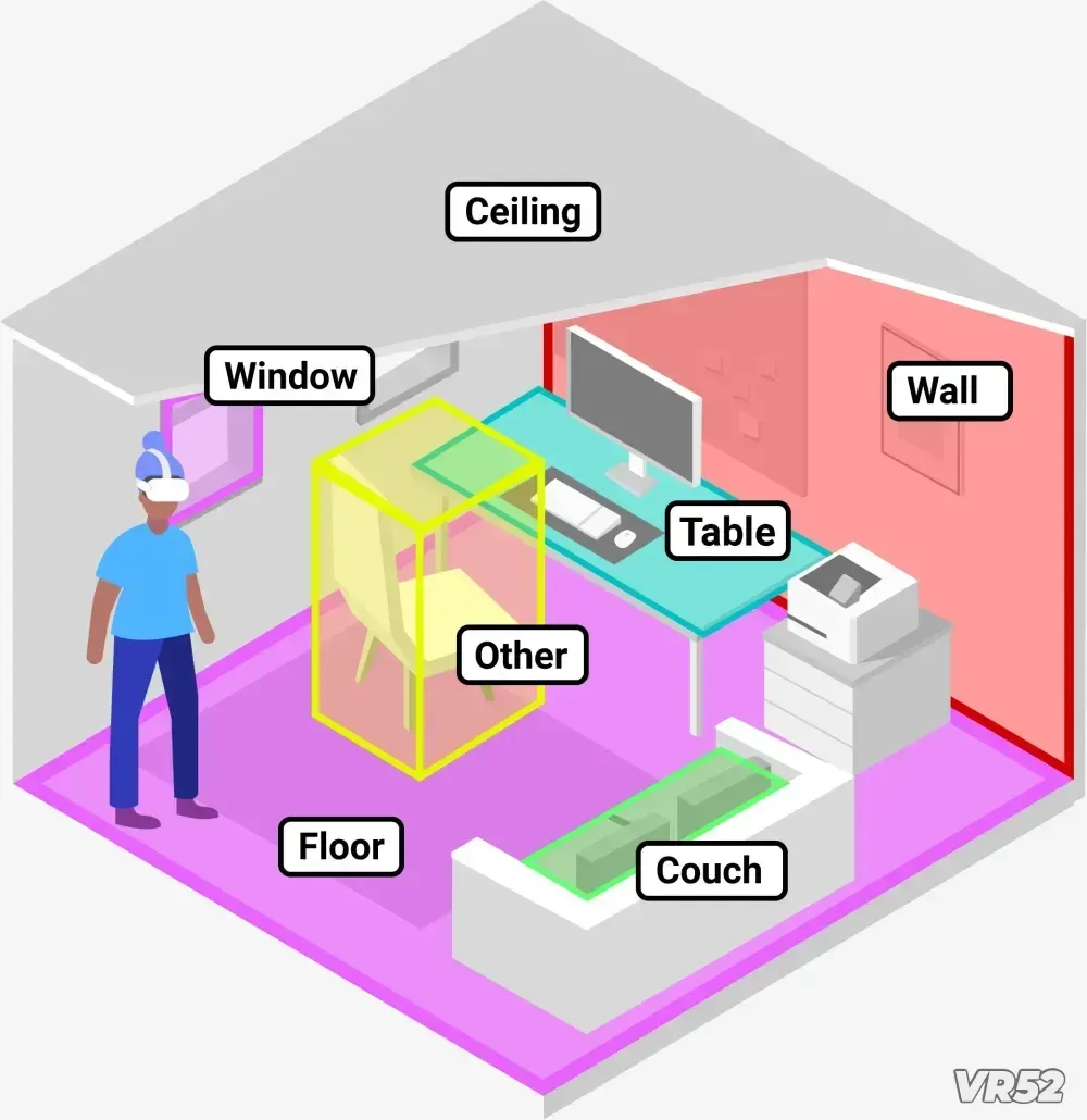 Quest 3与Quest 3S在混合现实“空间设置”过程中会生成房间的3D网格。系统可据此识别墙壁、地板、天花板,并为门、窗、床、桌、沙发、柜子、电视等物体生成带标签的边界框,供开发者通过Scene API调用,实现虚拟内容的智能摆放。