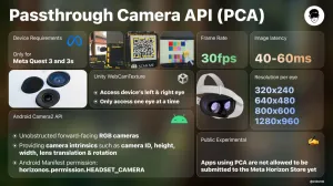 Meta最新发布的XRCoreSDK74.0版本为开发人员提供了对MetaQuest3的RGB摄像头的访问权限,这将推动创新的混合现实(MR)功能和应用的开发。这一新功能被称为直通摄像头API(PCA),为开发者带来了更多的可能性。新的直通摄像头API(PCA)PCA提供了对前置RGB摄像头的访问权限,允许开发人员提高其应用程序的生产质量(如灯光和效果),并驱动机器学习(ML)和计算机视觉(CV)管道,例如对象识别。虽然PCA目前处于试验阶段,开发者可以开始使用它来创建新的应用和功能,但尚不能将其发布到HorizonStore或集成到现有应用中。这是Meta推出新API的标准做法,预计在未来几个月内全面推出。技术规格与用户权限支持设备:PCA仅支持MetaQuest3和3S。性能参数:每个摄像头支持30FPS,最大分辨率为1,280x960像素,延迟在40到60毫秒之间。用户权限:首次启动应用程序时,用户需要授予摄像头访问权限,类似于麦克风访问权限。尽管第一批具有PCA功能的应用程序进入HorizonStore还需时日,但在未来几周和几个月内,您可以在Sidequest和GitHub等平台上看到许多有趣的示例。示例与展示Meta已经在GitHub上发布了一系列Unity示例,展示了如何利用PCA实现二维码跟踪、对象识别以及集成OpenAI视觉模型进行实时图像分析。此外,Meta的RobertoCoviello使用QuestCameraKit提供了五个额外的示例,进一步扩展了PCA的应用场景。在今天开幕的游戏开发者大会(GDC)上,Niantic、ResolutionGames和Creature工作室将展示他们使用PCA所取得的成果。这些工作室已经提前获得了API访问权限,并准备分享他们的创新应用案例。总结通过引入直通摄像头API,Meta为开发人员提供了强大的工具,以创建更具沉浸感和互动性的混合现实体验。尽管PCA尚处于试验阶段,但它已经展示了巨大的潜力。随着技术的不断成熟和完善,我们期待看到更多令人兴奋的应用程序出现在市场上。无论是增强现有应用的功能,还是创造全新的MR体验,PCA都将为开发者带来无限可能。