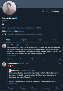 又又又又反转了,今天官方正式宣布SamAltman回归OpenAI,并担任首席执行官。短短几天,从解雇、回归,到出走微软,最终再次回归OpenAI,如此跌宕起伏的剧情,足以媲美影视大片。问题是,跌宕起伏的背后隐藏着怎样的秘密,未来OpenAI的发展又有哪些最值得关注的点?第一个问题在之前内容中有提到,这次重点分析刚刚曝出的马斯克收到的一封信。由于未知原因,这封信很快就被删除了,但是有报道对信的内容进行了总结。据悉,该信件原本是OpenAI前员工写给董事会,信中陈述对SamAltman和GregBrockman的不满,并要求董事会进行彻查。指控一:SamAltman为促进OpenAI向盈利模式转变,故意解雇很多反对的员工。比如从2018年1月至2020年7月期间,公司员工流失率约为50%。指控二:SamAltman和GregBrockman过于疯狂的追求实现AGI,意见相左的员工就会被赶走,另外在研究中也缺乏透明度和伦理道德上的限制。指控三:GregBrockman对一名正在变性的员工使用歧视性语言,并且这名员工最终因被指控表现不佳被解雇。指控四:SamAltman私下指示信息技术和运营人员对员工进行调查,利用OpenAI的非营利资源来推进自己的个人目标等。当然,其中的真实性如何,我们无从得知,相信每个人都有自己的判断,大家可以自己品。另一个问题,未来OpenAI的发展有哪些值得关注的点?首先从OpenAI的公告中看到,SamAltman将回归OpenAI担任CEO,并与BretTaylor(主席)、LarrySummers和AdamD'angelo三人组成新的初始董事会。与此同时,GregBrockman也宣布回归。如果不出意外,OpenAI的整个团队算是保住了,组团辞职逼宫的员工也可以静下心来投入到紧张有序的工作中去。毕竟今天ChatGPT再次宕机,再不维护好怕是名声不保。接下来最值得关注的问题,是非营利性组织向盈利性组织转变带来的问题,包括OpenAI能否保持初心继续造福人类,还是在盈利与伦理的平衡中失去底线。这个问题值得警惕,毕竟人工智能技术的推进存在着巨大的不确定性,这关乎着每个普通人的饭碗和安全。最后,如果不出意外,OpenAI的动荡很可能还会继续,所以就让我们在彷徨的同时,先继续嗑着瓜子静看OpenAI的大型宫斗剧吧~PS:付费用户可以安心了!