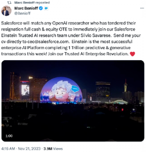 针对OpenAI创始人、"ChatGPT之父"奥特曼被董事会解职一事,已有超九成OpenAI员工辞职逼宫。对于要离职的员工,11月21日凌晨,Salesforce软件公司CEOMarcBenioff在社交媒体平台X上表示,将"匹配任何提出辞职的OpenAI研究人员立即加入"其爱因斯坦可信人工智能(SalesforceEinsteinAI)研究团队。此前,OpenAICEOSamAltman在X上发帖表示,他与微软首席执行官SatyaNadella的首要任务是确保OpenAI继续茁壮成长。Altman称,"我们致力于为我们的合作伙伴和客户全面提供运营连续性,OpenAI与微软之间的合作使这一点成为可能。"