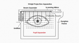 近日,美国专利商标局正式公布了苹果公司新获得的57项专利。在其中,有一项专利介绍了未来的智能眼镜与基于扫描的序列瞳孔扩张技术。在第一项专利中,苹果公司指出,图像投影设备用于将电子生成的图像投射到屏幕上或直接投射到观察者的眼睛中。例如,VR系统投射出图像,供观察者在游戏和教育应用中查看。AR系统将VR系统生成的图像与通过AR系统被动观察的场景相结合,例如在外科手术和复杂的机械装配等应用中显示叠加图像。图像投影设备可能会从多个来源发出不同波长的光,这些光可能显示为不同的颜色。(本专利和权利要求中使用的术语"光辐射"和"光"通常是指任何及所有可见光、红外线和紫外线辐射)。在视觉显示应用中,通常将红、绿、蓝三个波长范围称为RGB,其中中心波长640nm为红色,532nm为绿色,450nm为蓝色。根据所使用的光源类型,RGB波长还可以包括中心波长周围的光谱带,宽度为10nm、20nm或更宽。使用基于扫描的瞳孔序列扩张技术的显示屏苹果专利涵盖了一种图像投影装置,包括一个图像生成组件,该组件被配置为投射沿第一方向延伸的一系列线图像。扫描镜被定位为接收并反射线图像,同时围绕与第一方向平行的镜轴旋转。瞳孔扩大器具有一个边缘,用于接收扫描镜反射的线图像,以及一个向第二方向延伸的面,该面不平行于第一方向和边缘,其配置是通过面同时引导沿第二方向排列的扩大线图像的多个平行复制品。在一个实施例中,该装置包括控制器,该控制器被配置为与扫描镜同步驱动图像生成组件,使得线图像序列在通过扩瞳器表面投射的二维图像中形成连续的光栅线。在一些实施例中,图像生成组件包括多个光辐射发射器,这些发射器排列成沿第一方向延伸的线性阵列和准直光学器件,这些光学器件被配置为接收、准直和投射光辐射。光束扩展器被配置为在第一方向上接收和扩展准直辐射,从而在第一方向上扩大设备的瞳孔。在公开的实施例中,发射器被配置为发射多个不同波长的光辐射,并且该装置包括控制器,该控制器被配置为调制发射器,以生成线图像的相应像素。此外,光束扩展器还包括平行六面体光学透明棱镜阵列,这些棱镜沿第一方向设置。通常,阵列中相邻平行六面体棱镜之间的界面包括光学涂层,该涂层被配置为部分反射和部分透射撞击界面的光辐射。苹果专利图1和图2是图像投影装置的前视图和后视图。苹果专利图9为图像投影装置的正面示意图;图4是图像投影装置的剖面示意图,示出了图像生成组件和扫描镜组件的细节;图5是图像生成组件的细节示意图,显示了光束扩展器的光学操作细节。