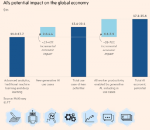生成式人工智能在使用和复杂程度方面都在迅速发展。自2022年11月公开发布OpenAI基于语言的大型聊天机器人ChatGPT以来,尝试生成式AI的人数迅速增长。在推出的前五天内,该平台的用户数量就超过了一百万。InsiderIntelligence预测,到2023年底,美国25%的互联网用户(近8000万人)每月都会部署生成式人工智能,高于2022年底的8%。据称,到2024年,这一比例将上升至33%。与许多新技术不同的是,55岁至64岁的用户多于12岁至17岁的用户,因为前者会在办公室尝试人工智能。人工智能现象不仅限于美国。Salesforce分别在美国、英国、澳大利亚和印度等四个国家,进行人口调查,其中一半人使用过生成式人工智能。而印度处于领先地位,有近四分之三的受访者尝试过该技术。自公开发布以来,生成式人工智能模型的功能得到了改进,对自然语言的理解、再现和准确性都变得更好。数字体验平台Yext首席数据官ChristianWard表示,尽管技术先进,但有了生成式人工智能,人们不再需要精通技术。人工智能"懂人类",让人类能够自然地与它沟通,使其更容易使用。牛津大学计算机科学教授MichaelWooldridge称2023年是生成式人工智能的"分水岭年"。这项技术将像微处理器一样具有变革性,使其在个人电脑、网络和智能手机的应用成为可能。虽然这些需要数月或数年的时间才能流行起来,但生成式人工智能的发展速度非常快,很难想象其全部效果。尽管该技术还很年轻,但它已经渗透到商业领域。高盛经济学家约瑟夫·布里格斯(JosephBriggs)预测10年内,它能为全球经济带来的价值将占国内生产总值(GDP)的7%(7万亿美元),而麦肯锡(McKinsey)的预测则为每年2.6万亿美元至4.4万亿美元。银行、生命科学和高科技可能是收益最大的行业。营销、销售和客户体验都将受到深刻影响。人工智能对自然语言的使用意味着其基于语言的大型版本特别适合创造性的工作。当今的工具可以帮助生成文本、音频、视频、音乐、代码、图像和设计。例如,基于利用大量在线数据的模型,生成式人工智能充分掌握句子的各种方向,似乎能够无数次地创造出完全原创的作品。除了书面文字之外,生成式人工智能还将根据文本描述创建图像,而人工智能生成的输出也引发了版权问题。可以说,生成式人工智能在创意领域的应用比在科学(研究和工程)领域的应用更大,因为科学领域的准确性和可靠性更为关键。这颠覆了几年前的期望,当时机器被认为可以在繁重或死记硬背的任务中增加最大价值。凭借其意想不到的创造力,生成式人工智能可以承担曾经被认为是技术无法触及的工作。高盛估计,美国和欧洲四分之一的工作任务可以通过生成人工智能实现自动化。在其潜力的上限下,行政和法律行业40%以上的任务可以实现自动化。