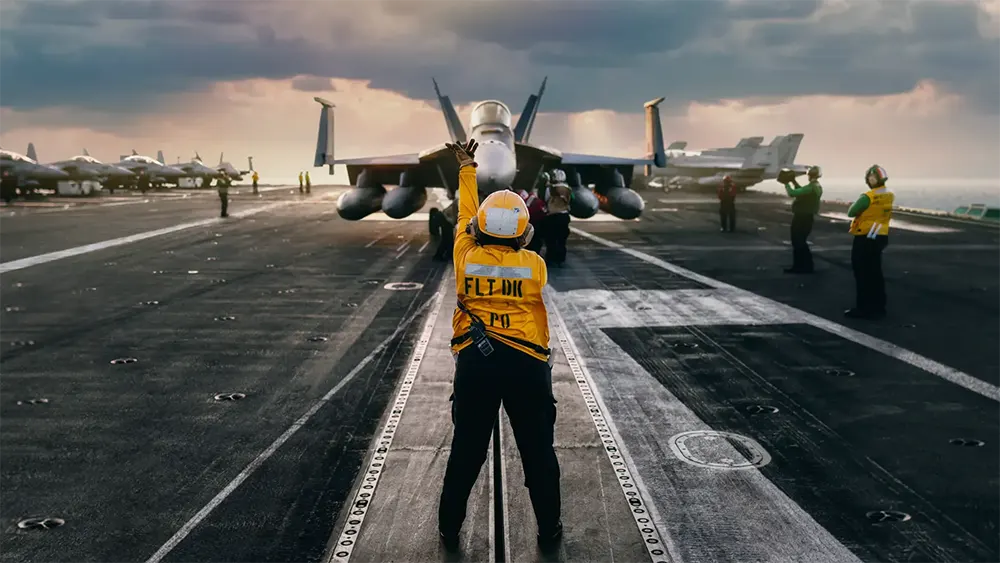 影片开篇即引用一句经典描述:“航空母舰的飞行甲板,是地球上最混乱的地方。” 随后通过大量第一视角镜头,展现舰载机弹射起飞、拦阻着舰的震撼瞬间,以及甲板调度员、飞行员与塔台指挥官的协同作业。