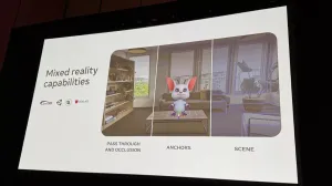 在2025年3月举行的GDC(游戏开发者大会)上,题为"融合现实,倍增奇迹:混合现实开发专家指导"的会议吸引了广泛关注。来自Meta、ResolutionGames、Niantic等公司的专家分享了最新的MR(混合现实)开发见解和技术进展。以下是会议的精华内容。MR的基本要素与吸引力Meta产品经理KirkBarker首先介绍了混合现实的基本概念和关键组件。他以《GuardianofRealms》这款混合现实游戏为例,描述了虚拟入侵者如何进入用户的客厅,并展示了如何在现实环境中进行互动战斗。主要技术要点:透视与深度感应:头戴式设备上的摄像头捕捉现实世界的图像,并使用深度API检测物体的距离,实现虚拟和物理物体之间的自然遮挡。锚点:在3D坐标空间中设定参考点,确保虚拟物体固定在同一位置。例如,将海报贴在墙上后,它会始终保持在该位置。场景理解:识别房间结构和家具的技术,为开发者提供语义信息(如墙壁、天花板、沙发、床),从而创建与现实世界空间相对应的游戏体验。Barker强调,通过结合这些元素,可以创造出引人入胜、具有沉浸感和互动性的混合现实体验。设计更具沉浸感的MR体验Creature工作室创意总监DougNorthCook分享了开发MetaQuest混合现实游戏《StarshipHome》的经验:关键设计原则:表面感知:设计能够适应任何表面的虚拟物体。例如,花盆可以根据环境变化调整其外观和行为。产品设计思维:虚拟物体需要像真实物体一样细致且具有交互性。目标是让用户愿意移动真实的家具来容纳虚拟物体。让不可能成为可能:创造看似不存在但感觉存在的元素。例如,储物格延伸到地板以下15英尺,给用户带来逼真的体验。直观的操作:确保用户能通过观察了解物体的功能,并在必要时使用标签或其他标志。互动深度:每个操作都融入声音和动作反馈,增强物理力学的感觉。团队称之为"Goopy"元素,这是取悦和惊喜用户的关键。Cook强调,"混合现实的神奇之处在于它可以在任何空间创造新的记忆"。他鼓励开发者将房间本身视为一个角色,并在任何环境中提供有意义的体验。透视摄像头API及其应用案例KirkBarker接着介绍了3月份发布的全新透视摄像头API。该API允许开发者访问耳机的前置摄像头,捕获现实世界的图像并在应用程序中使用它们。主要用例:对象检测:结合机器学习框架(如YOLO算法),识别现实世界的物体并显示边界框和概率。纹理映射:将现实世界的纹理应用到虚拟物体上,使虚拟物体更好地融入环境。滤镜应用:调整现实世界的亮度和颜色,增强视觉效果。Barker展示了一个使用YOLO算法的示例,该算法从HuggingFace下载,编译到Unity中,并与透传API结合,展示了如何识别现实世界的物体并显示相关信息。游戏案例研究ResolutionGames首席执行官TommyPalm分享了三个利用透视摄像头API的游戏案例:SpatialOps:一种新型射击游戏,玩家可以利用家里的空间与远方的玩家进行多人游戏。虚拟障碍物逐渐与房间融为一体,增加了沉浸感。实验室老鼠:异步多人游戏体验,其中一个玩家的房间通过透视摄像头进行3D扫描,另一个玩家以鼠标形式进入该空间解决谜题。TwentyGuys:玩家通过混合现实头戴设备观看2D图像创建玩偶纹理,生成角色并进行独特游戏体验。Palm强调,这些游戏不仅展示了技术的强大功能,还突显了混合现实在减少晕动症方面的优势。Niantic的HelloDotNiantic执行制片人AliciaBerry讲解了将手机AR游戏Peridot移植到Quest3的过程,即《HelloDot》。她介绍了几个关键技术应用:Dot摄像头:跟踪Dot的摄像机模式,使用Niantic的3D扫描应用Scaniverse对房间进行扫描,然后将其渲染为高斯图。物体检测:使用Niantic专有的ARDK(增强现实开发套件)检测现实世界中的物体。例如,Dot发现一棵树并感到兴奋。Berry还展示了"路线指引"的使用案例,通过高斯斑进行空间导航,引导用户在现实世界中移动。通过这次会议,开发者们深入了解了MR技术的进步和应用场景。Meta的新透视摄像头API为开发者提供了更多工具,使得混合现实体验更加丰富和沉浸。无论是通过表面感知、产品设计思维还是直观操作,开发者都能创造出令人惊叹的混合现实体验。未来,随着技术的不断进步,混合现实将在更多的领域中发挥重要作用。