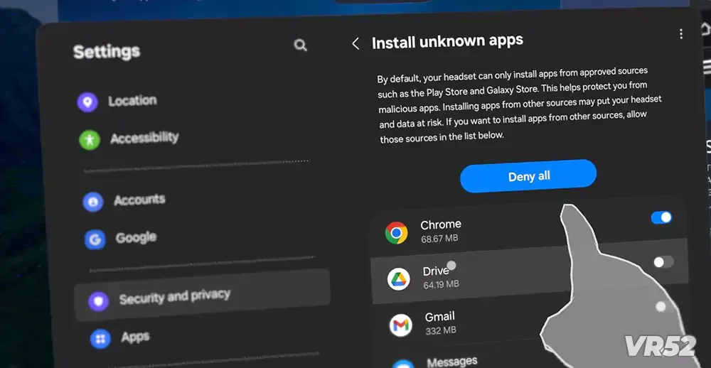 相比之下,Galaxy XR的体验则简洁得多。据VR52网实测确认,用户无需开启开发者模式,也无需连接PC,即可直接在设备内置的Chrome浏览器中下载Android APK文件并完成安装。只要在“设置-安全与隐私”中授予浏览器“安装未知应用”的权限,整个过程便畅通无阻。
